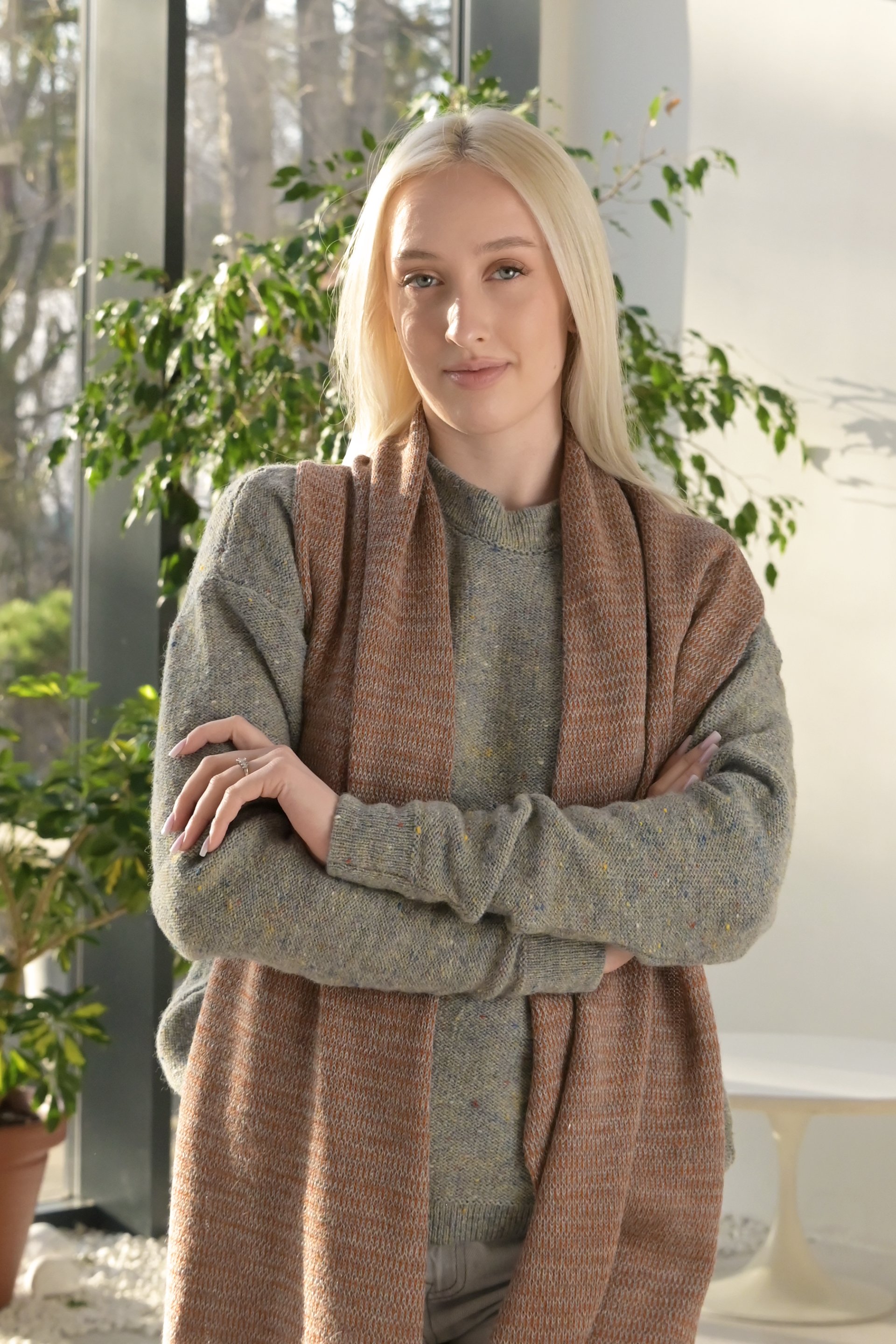 Extra fine knitted, soft, wide scarf in fair-isle style — designed for the fancy chick who loves cozy.